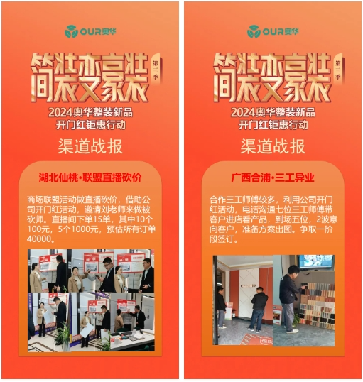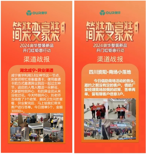 一年春作首,萬事行為先。奧華終端市場以只爭朝夕的心態,做久久為功的準備。奧華簡裝變豪裝活動期間,奧華各終端門店多渠道發力,開啟突圍戰,搶占市場。