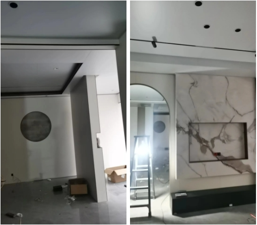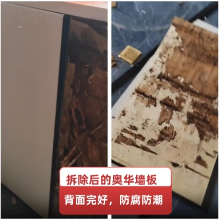 在奧華貴溪老店重裝現場,施工人員對原有靠窗墻體進行拆除時,木工板的地方已經完全腐爛,但是相鄰的奧華墻板卻沒有任何變化,背部仍然非常光滑,進一步證實奧華墻板真正做到了防霉,防潮等效果,也讓經銷商對奧華產品,奧華品牌更加有信心。